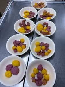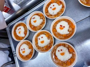 ハロウィンメニュー 2025/11/03 今日はハロウィンメニューの紹介です。 給食におばけの形のハヤシライス、おやつにハロウィンクッキーが出ました👻🍪 4歳児は、自分たちで型抜きをしたり、形を作って楽しみました! By S先生 一覧へ戻る
