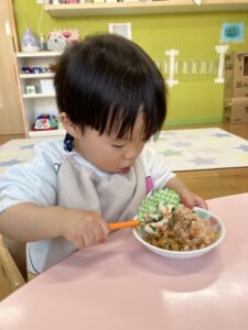 スプーンで嬉しそうに食べている0歳児さん