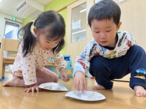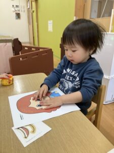 1歳児クラスも福笑いに挑戦!目の位置ここかな?