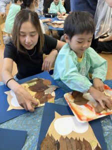お母さんと一緒に嬉しそうにふくろうの羽に見立てた落ち葉🍂を貼っている様子
