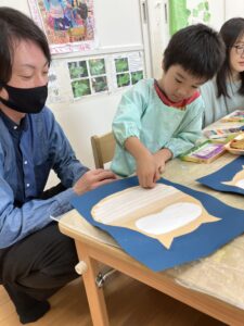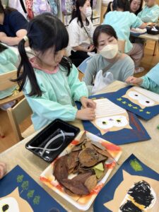 最後の仕上げのふくろうの身体の羽と目を描く工程を保護者と一緒に行いました。