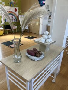 お月見会のお供え物 さつまいも 里芋 お団子 すすき