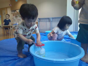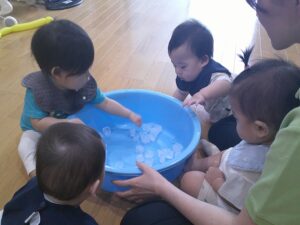 乳児クラスでは、初めて園で水遊びをする子も多く、「どんなことをするんだろう?」と不思議に思う表情をしていました。テラスにタライの水を置いておき、全身で浴びてびしょ濡れになって水の気持ち良さを味わったり、水に触れて冷たさや感触を楽しんだりしていました🎵