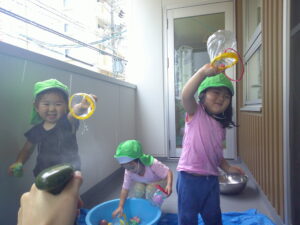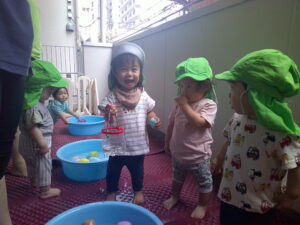 保育園では、テラスや屋上で水遊びを楽しみました!