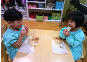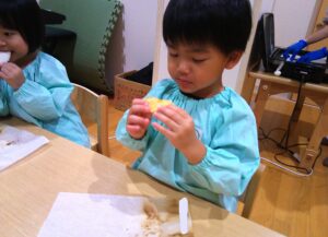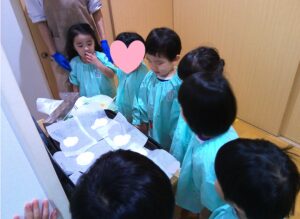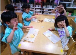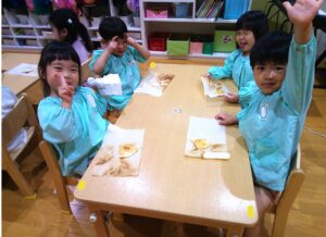 先日、ほし組(3歳児)のウィズブック活動で、クッキングをしました!