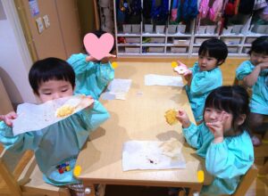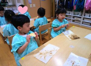 『はんぶんこしようね』というウィズブック絵本に出てくる、おせんべい🍘初めて食べる子もいたようで、興味津々!とっても楽しみにしていました。