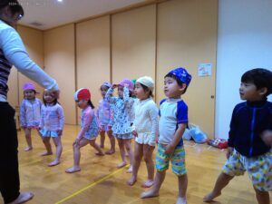 水を掛け合ったり、バタ足をしたりとダイナミックに遊ぶ子ども達😊