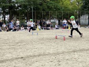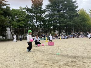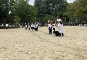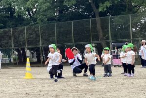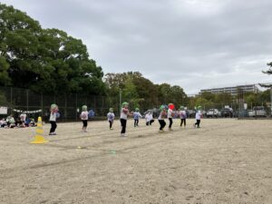 初めての運動会で緊張している子もいましたが、先生がお名前を呼ぶと「はーい!」とお返事をして元気いっぱい走る事ができました!
