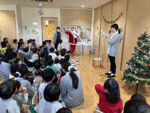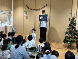 「サンタさんはどこに住んでいるの?」「サンタさんは、どうやってみんなのおもちゃを作っているの?」という質問に対し、「フィンランドっていうとても寒い国だよ」「サンタさんのほかに、小人さんがたくさんいて、おもちゃ作りを手伝ってくれるんだよ」とお話をしてもらい、「そうなんだ!」「すごいね!」ととても嬉しそうな子ども達でした💖