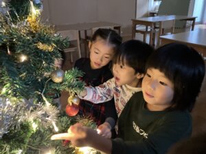 部屋の電気も消したので、ピカピカと光るクリスマスツリーがとても綺麗で、見とれる子ども達でした。