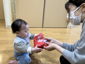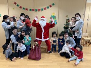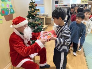 サンタさんが登場すると「やっぱり!」「サンタさんだ!」と嬉しそうに話していました。乳児クラスのお友だちはサンタさんと写真を撮り、クラスに戻ってからサンタさんの代わりに園長先生よりプレゼントをもらいました🎁