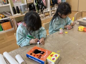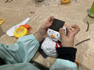 帽子や目、口を作っていきました!マフラーは、毛糸で編んでいた作った子もいて、想像力に驚きました✨