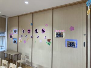 会場となる保育室には、乳児クラスのお友だちが作ってくれた吊るし飾りや、各クラスからの写真付きメッセージが飾られました🎵