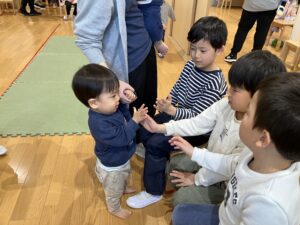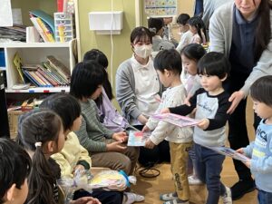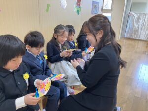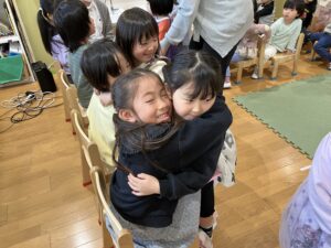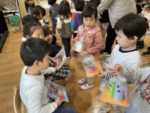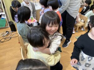 各クラスのお友だちから、そら組の子へ「たくさん遊んでくれてありがとう」と感謝の思いを込めた手作りのプレゼントを渡しました。在園児とそら組さんで「ありがとう」を伝え合い、ぎゅっとハグをする姿も見られ、素敵な時間となりました✨