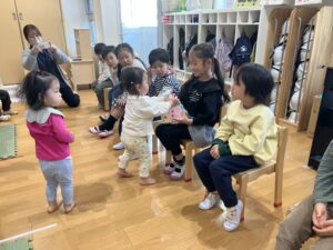 プレゼント渡しを終えると、在園児から「みんなともだち」の歌のプレゼントをしました🎶