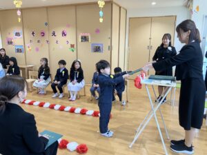 本番が近づくにつれて、緊張した様子も見られましたが、素敵な卒園式用のお洋服に身を包み、少し照れくさそうにしながらも、かっこよく入場することができました✨