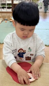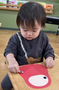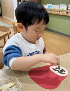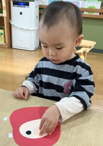 2歳児さんは「まゆげは、ここ」と確認して貼っています。