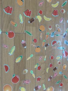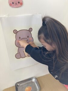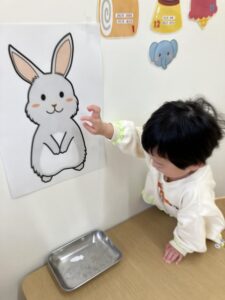 2日目は何やらおいしそうなカードがたくさん出てくると興味津々のこどもたち。「動物さんたち召し上がれ」と動物たちに食べさせてあげる活動です。壁に貼った動物の絵の口の部分に切り込みがあり、食べさせてあげることが出来るとわかると、やってみたくてワクワクした表情になりました。