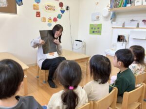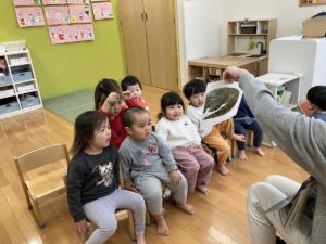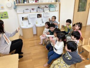 絵本を読む前には手遊びやお歌を歌って楽しんでいます。楽しくて「もう1回!」とリクエストをしてくれるつき組さんです。