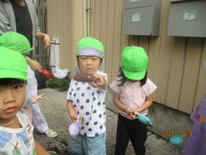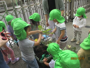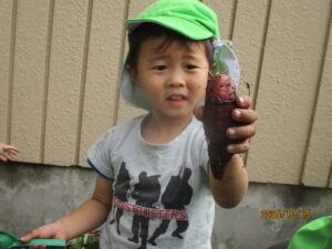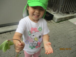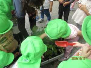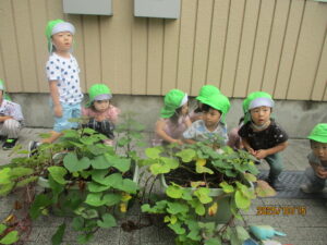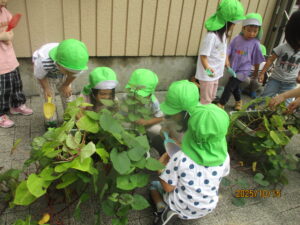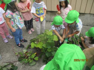 「さつまいも掘りを保育園でもやってみたいな…。」という先生達の思いもあり、プランターでさつまいもを育てることに挑戦しました!!5月に苗を植えて、順番に水やりをしながら大切に育ててきました。