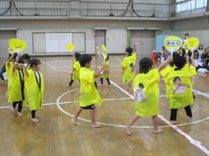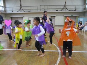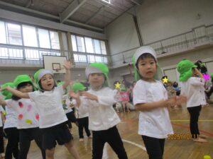 つき組(2歳児)は、「やんちゃ怪獣どっか~ん!!」音楽に合わせて元気いっぱい踊りましたよ。