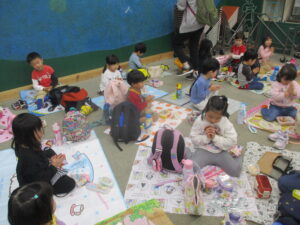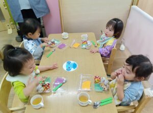 「私のお弁当見て!!」「このおかずを入れてって昨日お願いしたんだ!!」など、お友達と会話を楽しみながらご機嫌で食べていました。とても楽しい1日になったね!!