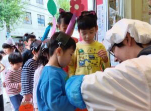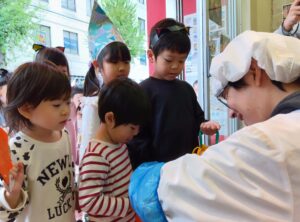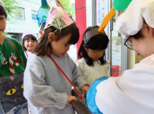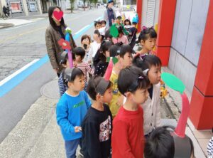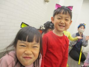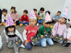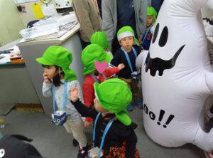 みんなで、ハロウィン会をした後は、保育園の近くにあるウェルネス高等学院と、いつも給食で食べているお肉を届けてくれる宮田精肉店へ行きました。