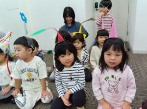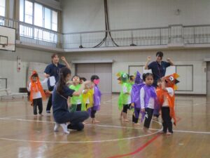 つき組(2歳児)は、「やんちゃ怪獣どっか~ん!!」音楽に合わせて元気いっぱい踊りましたよ。