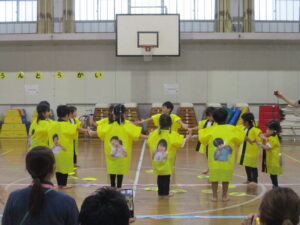にじ組(4歳児)は、ゆずの「スマイル」という曲です。自分達で作ったスマイルうちわやニコニコの自分の写真を付けたはっぴを着て、ニコニコ笑顔で発表することができました。