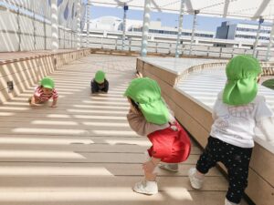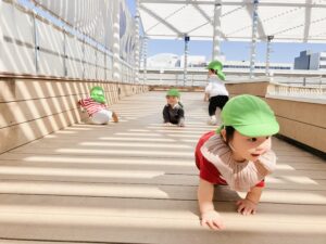 広ーいバンテリンドームの広場で思いっきりハイハイをするゆきぐみさん。
