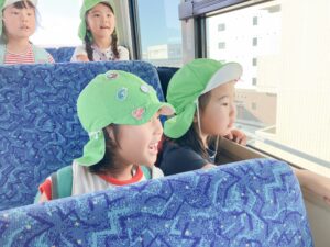 いつもは、保育園の屋上から見ていた上空を走るバスに乗れるとあって子ども達は、ドキドキの
