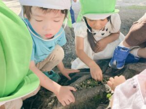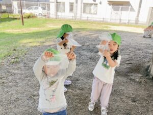 しゃぼん玉をしたり、虫探しをしたりと元気いっぱい遊ぶことが出来ました。