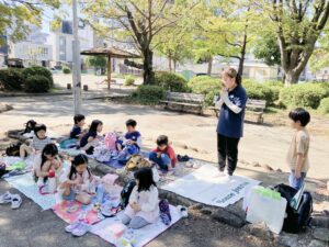 矢田公園に着くと今月のウィズブック活動から始まります。絵本の読み聞かせをしてもらってる子ども達は