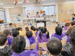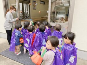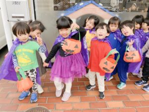 2階の幼児クラスに各クラス手作りのコスチュームを付けてみんなで大集合!