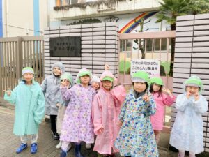 小雨が降る中となりましたが、子どもたちは元気にレインコートを着て小学校までお出掛けしました。