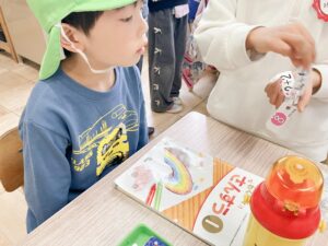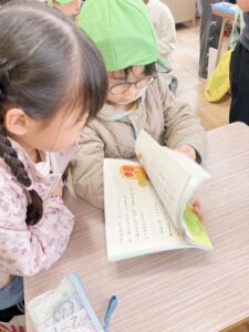 教室に入ると1年生のお友だちが優しくそら組さんを招き入れてくれて、さっそく1年生の教科書や