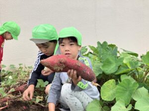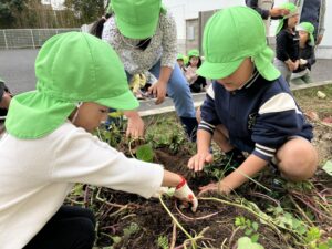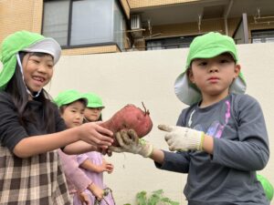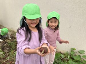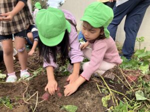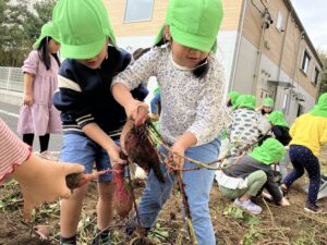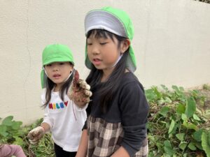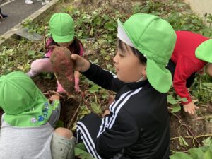 ★秋になったのでおいもほりをしました。埋まっているお芋の周りの土を掘って引っ張らないと取れない!