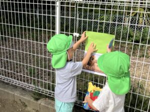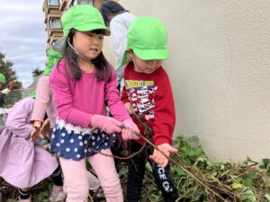 活動の時間は短く設定をし、終わったら違う遊び(この日は園庭での戸外遊び)をしますがその中で先ほどの遊びに繋がることもあります。また異年齢児のクラスと関わることで遊びも膨らみます。