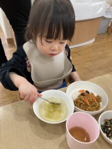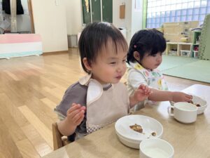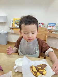 食育用のエプロンをつけるのが嬉しくて嬉しくて、食育の日はおむつ替えから手洗いまで何でも早く済ませてしまうつぼみ組さんです😊