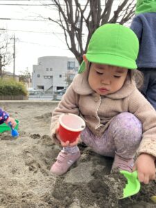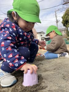カップに砂を入れてひっくり返す、型抜きが上手にできるようになりました✨️