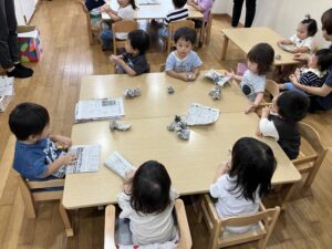 午前中のウィズブック活動の中で新聞紙を使い、みんなでにぎにぎぎゅっぎゅっと丸める練習をしました。