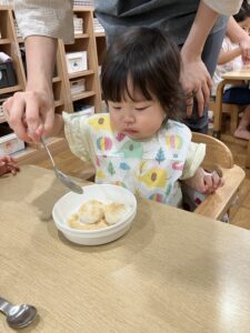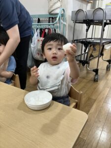 午後のおやつの時間にはラップに包まれたお米を自分でぎゅっと握って、その上にきな粉をかけておいしく食べました。