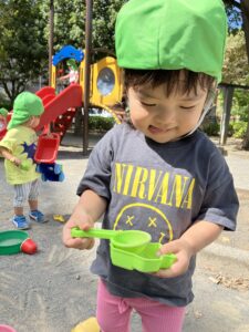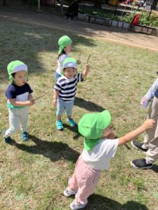 2歳の子どもたちは、好きな棒を選んで大きく振りかぶってやる気満々なかっこいい姿を見せてくれました!💪🔥