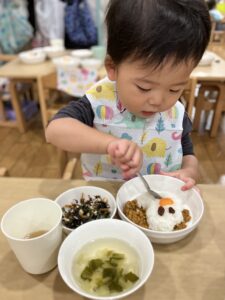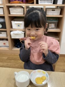 午後のおやつの時間にはラップに包まれたお米を自分でぎゅっと握って、その上にきな粉をかけておいしく食べました。