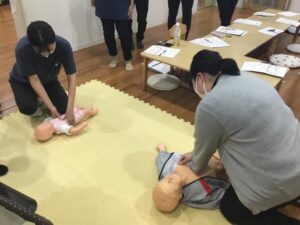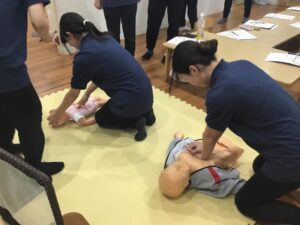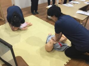 最初に予習として救命用人形(乳児・幼児)を使用して心肺蘇生を行います。