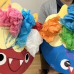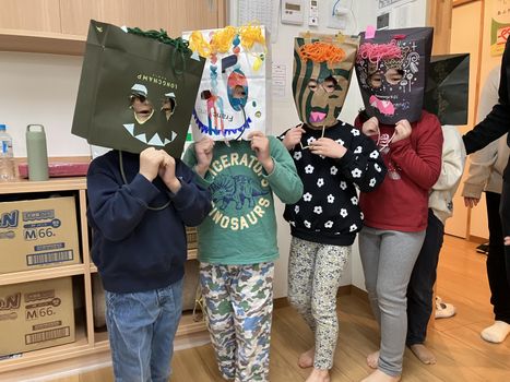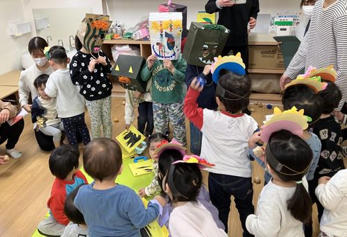 各クラスで鬼のお面、ツノを作ったり、鬼柄のカバンを作ったりしたものをみんなに披露しました🤗
