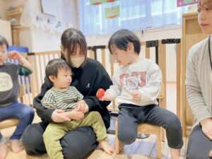 「ありがとうって英語でなにか知ってる?」と聞くと「thank you!」とすぐに英語に訳せる子もいましたよ。お隣のお友だちに「for you」と伝え、「thank you!」と受け取る英語でのやりとりを楽しみました。