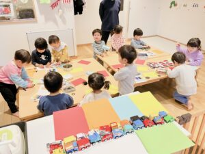 活動後も「自分でくるま作ったね」と友だちと振り返ったり、お迎えの保護者の方に嬉しそうに作品を見せたりする姿があり、この体験が子どもたちにとって特別なものになったことを感じました。自分で考えて作り上げる喜びが、次の意欲へとつながっているように思います。