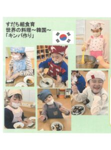 すくわく活動で世界をテーマに食育を行っているすだち組。1月は韓国料理のキンパを作りました。