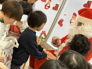 音のなる方を見ると、サンタクロースがプレゼントを持って来てくれました!!